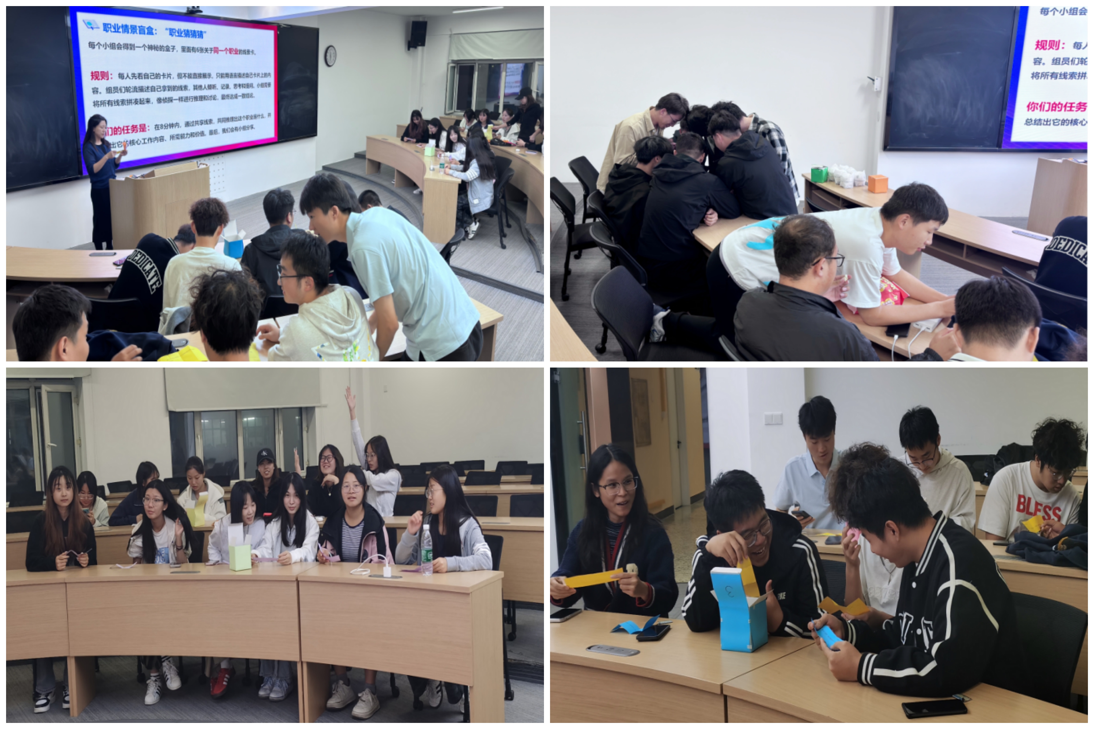 活动的最终高潮是精心设计的“职业猜猜猜”互动环节。各小组领取了一个内含六条职业特征线索的“盲盒”,成员们需在八分钟的倒计时内,通过团队协作与逻辑推理,拼凑出完整的职业画像。现场讨论热烈,同学们依据“网感好、创意足”、“策划爆款内容、撰写文案”等线索进行深入分析与激烈讨论,最终成功“解锁”了包括新媒体运营在内的多个目标职业。通过模拟职业情境和线索推理,使同学们在实践中体验职业探索的过程,增强了对职业内涵的认知和理解。