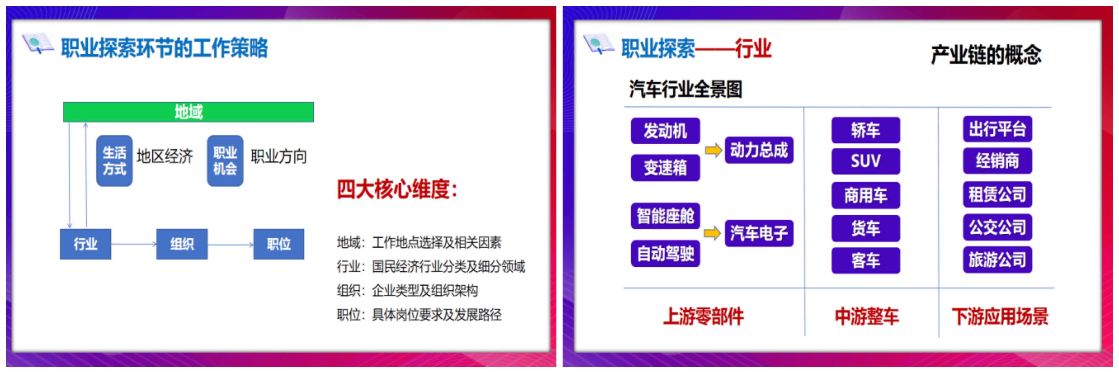 活动的下半场聚焦实践和方法论。李薇系统阐述了职业探索的四大核心维度:“地域、行业、组织、职位”,并为在场大学生提供了针对性的职业调研策略与实用工具:在城市选择上,李薇建议应超越个人偏好,采取数据化与产业化的双重分析框架。她推荐结合《城市商业魅力排行榜》与“产业聚集区”理论,根据不同产业的地理分布特点(如电子信息产业集中于长三角、珠三角,传媒影视业以北上广为核心)进行科学决策。在行业选择方面,她提出了一套系统性评估方法:首先关注国家政策导向,如硬科技与新能源等战略领域;其次分析行业的核心驱动力,判断其为技术驱动或资本驱动;最后,通过“产业链地图”等工具,对目标行业进行从上游到下游的全面梳理,以规避潜在风险,实现精准切入。同时,她还介绍了一些职业工具:学职平台、O*NET、知乎、看准网……现场同学纷纷拿起手机疯狂收藏。