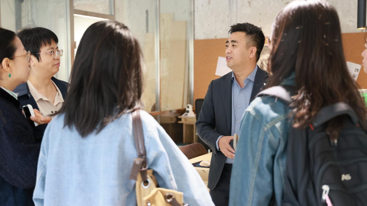 艺术学院董磊院长为北大师生详细介绍了艺术学院成立的池上装饰工程设计有限公司,其作为校内实践平台,学生从大二起即可参与其中的真实项目,实现学习与岗位能力的无缝对接。